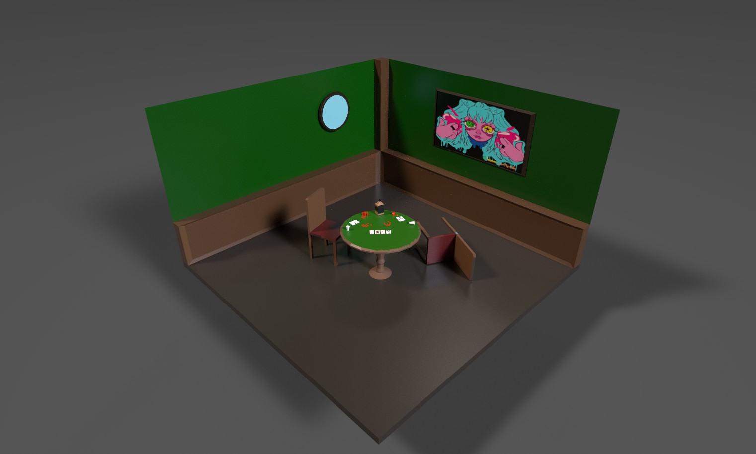 this is a small room used for gambling i modelled in blender for the 3D modeling blender game jam hosted by Kiri (https://itch.io/profile/kiri-soft).
